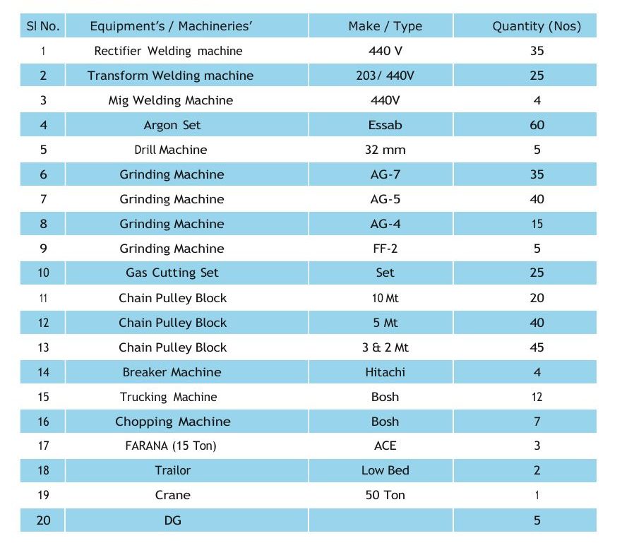 In our other project we have taken the work order from our clients without machinery, tools & tackles and consumables. For our new projects we are prepared to purchase the required machineries and tools kit for that job.