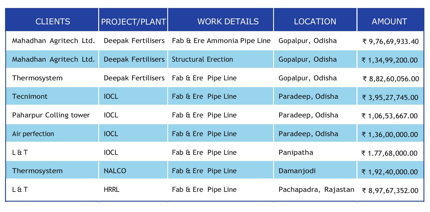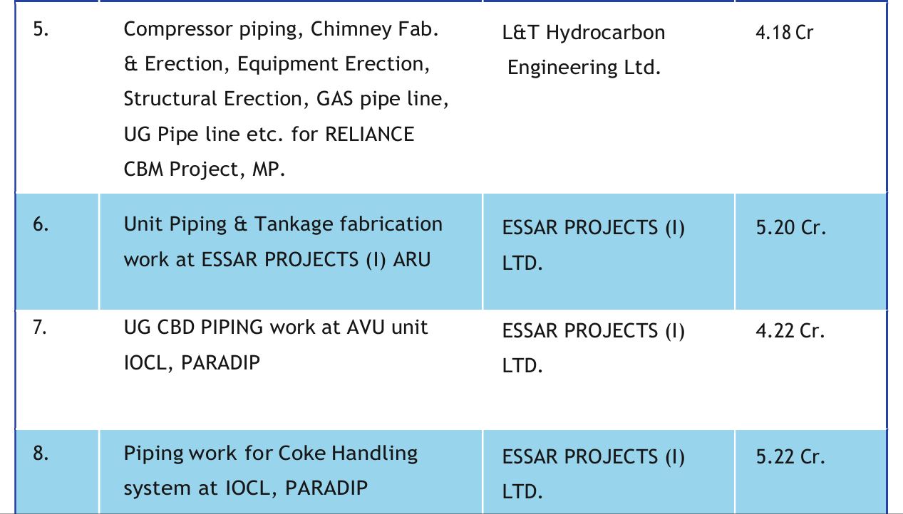 We have well trained disciplined and obedient technical staffs and work force with high degree of integrity. We have executed various activities and are specialized in Hydrocarbon projects. We are experts in Mechanical, Electrical & Civil Constructions like – Unit Piping work on Oil & Gas pipe lines , pumps, Exchanger area & rack piping at ARU Unit, BAAF Unit, BARC Unit, AVU area and NHT/CCR Unit of Refinery project at IOCL Refinery project , Paradeep. We have also done Fabrication & Erection of Steel Structures, Duct lines, Conveyor lines, SS & CS pipe lines, water pipe lines in different Steel& Power projects. Also we have done lots of Telecom Projects like Construction of Tower foundation, Tower Erection, Electrification of Tower & wiring of Electrical & Electronics equipment’s like BTS machines, Panel Boards etc.And now we are working for the complete system of Coke handling system like- Coke Run off pond, Dust Suppression system, DE system at IOCL Refinery project, Paradeep under Bengal Tools LTD. We have done more than Rs. 50 Crores of work by us with excellent performance.